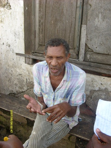 (…)O Sr. Januário com mais de 89 anos, é o residente mais idoso desta comunidade que habita a antiga empresa Diogo Vaz. Chegou a S. Tomé em 1918, trabalhou em regime de contrato, embora na realidade segundo o seu depoimento, o tenha feito em regime de trabalho forçado até à altura da independência. (…). Já com uma idade avançada, o Sr. Januário nega a vontade de regressar ao seu país de origem pelo facto de estar bem enraizado em S. Tomé; esta é pois a sua casa. (…)
